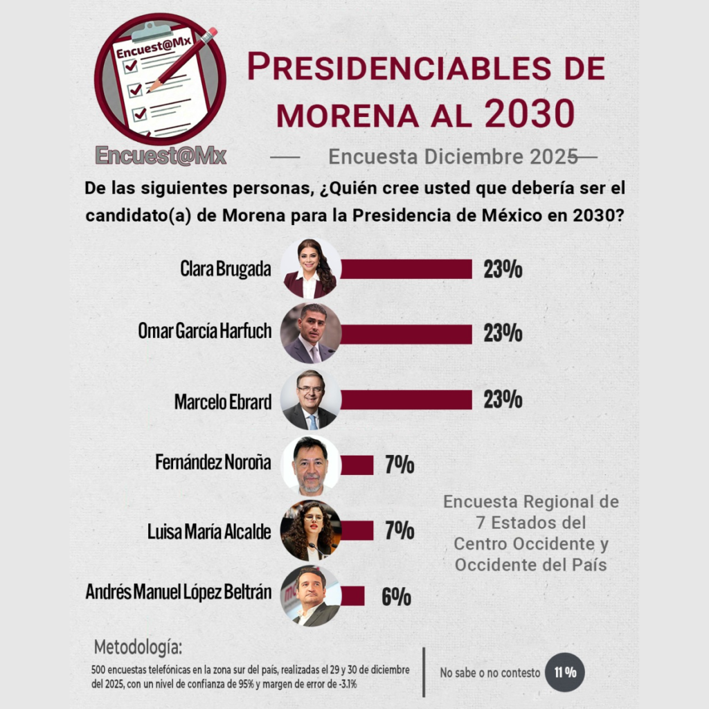 Ciudad de México. — Una encuesta telefónica realizada en diciembre de 2025 en siete estados del centro-occidente y occidente del país revela un escenario de empate técnico entre tres aspirantes presidenciales rumbo al proceso electoral de 2030.