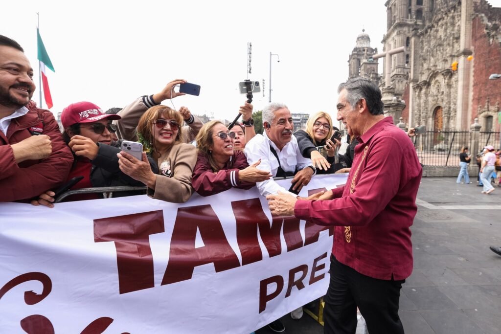 Ciudad de México, 6 de diciembre de 2025. — El gobernador de Tamaulipas, Dr. Américo Villarreal Anaya, acompañado de su esposa, la Dra. María de Villarreal, encabezó la comitiva tamaulipeca que se sumó a la multitudinaria concentración en el Zócalo capitalino, donde más de 600 mil mexicanas y mexicanos acudieron a celebrar la transformación convocada por la presidenta de México, Claudia Sheinbaum Pardo.